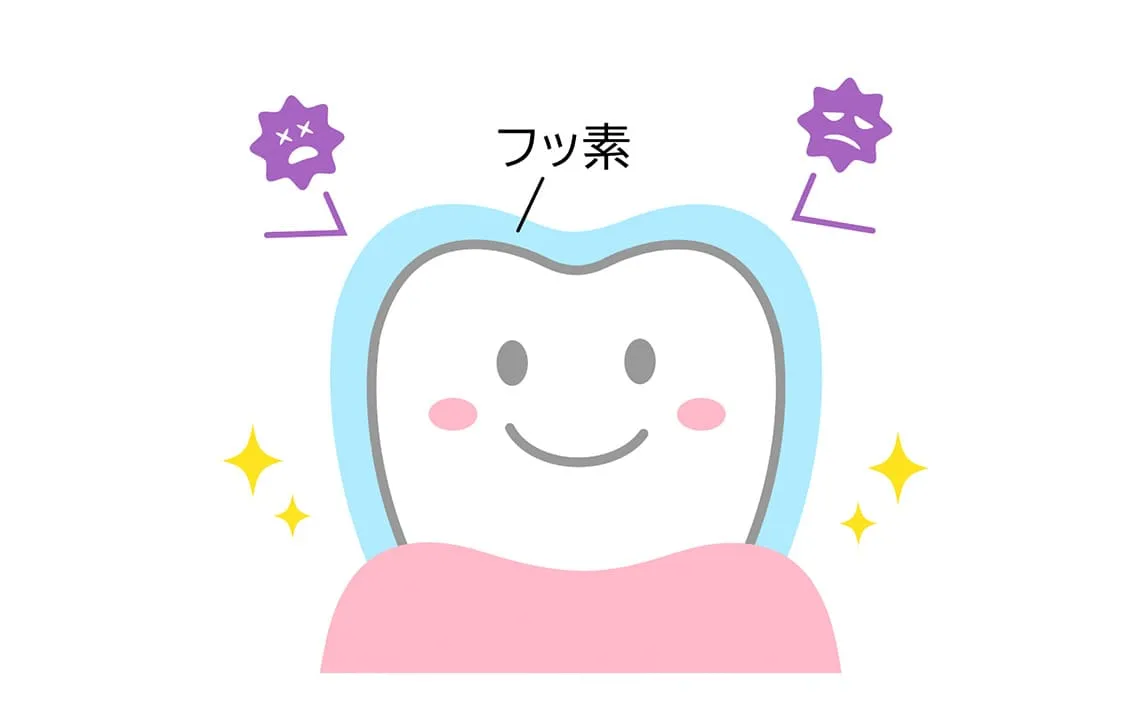 歯磨き剤にも配合されているフッ素には、酸によって柔らかくなり始めたエナメル質を、再度硬くしてくれる「再石灰化」の作用があります。また、むし歯を促進する細菌類の活動を弱め、酸の産生を抑える働きもあります。